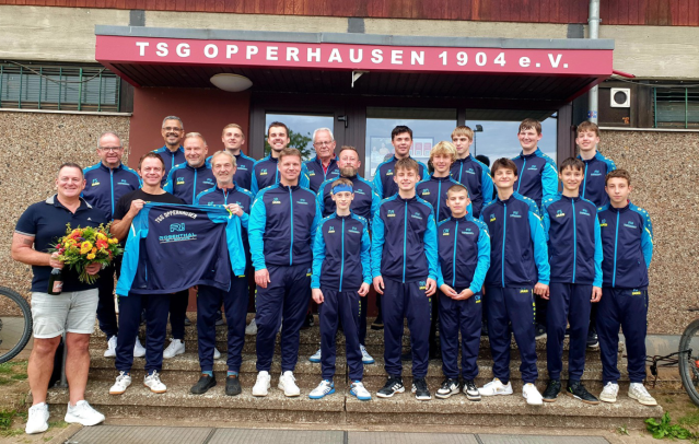 Rechtzeitig zur neuen Saison 2024/2025 darf sich die Tischtennis Abteilung der TSG Opperhausen über neue Trainingsanzüge freuen. Möglich gemacht hat dies der in Opperhausen ansässige Unternehmer Marc Rosenthal, der alle vier Herrenmannschaften sowie die beiden Jugendmannschaften mit den schmucken, farbenfrohen Outfits ausstattete. Spartenleiter Mathias Wrisberg bedankte sich im Namen aller Spieler mit einem Blumenstrauß und einer edlen Flasche für die großzügige Spende.